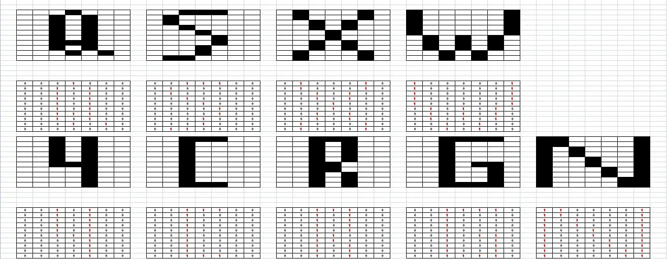 Obs. As letras abaixo devem estar em binário, onde 0 é o espaço em branco e 1 é o espaço composto pela letra. Segue a foto em Attachments Letras Binárias.jpg