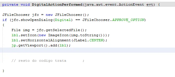 Filearquivo=jfc.getSelectedFile(); // obtem a referencia do arquivo imagem, pode ser reutilizadaBufferedImageimagem=ImageIO.read(arquivo); // obtem a imagemImageIconicone=newImageIcon(imagem);lbl.setIcon(icone);