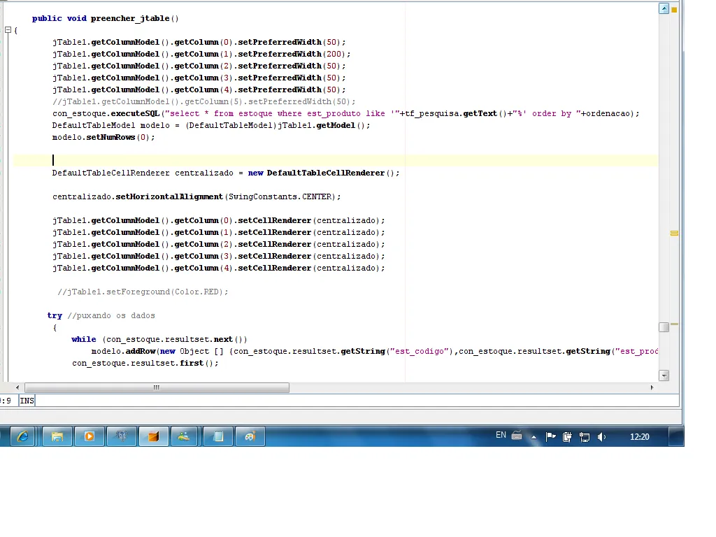 modelo.addRow(new Object [] {con_estoque.resultset.getString("est_codigo"),con_estoque.resultset.getString("est_produto"),con_estoque.resultset.getString("est_quantidade"),con_estoque.resultset.getString("est_precocusto"),con_estoque.resultset.getString("est_precovenda")});