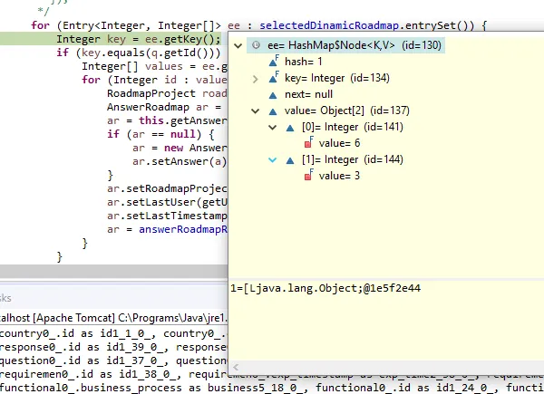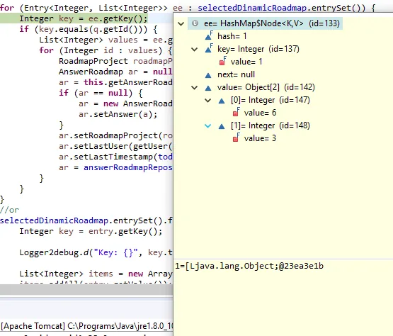 privateMap<Integer,List<Integer>>selectedDinamicRoadmap=newHashMap<>();//gets and setspublicvoidsave(){for(Entry<Integer,List<Integer>>ee:selectedDinamicRoadmap.entrySet()){Integerkey=ee.getKey();List<Integer>values=ee.getValue();/* Caused by: java.lang.ClassCastException: [Ljava.lang.Object; cannot be cast to java.util.List */for(Stringid:values){//saveData}}}//orselectedDinamicRoadmap.entrySet().forEach(entry->{/* java.lang.ClassCastException: [Ljava.lang.Object; cannot be cast to java.util.Collection */Integerkey=entry.getKey();Logger2debug.d("Key: {}",key.toString());List<Integer>items=newArrayList<Integer>();items.addAll(entry.getValue());items.forEach(item->{Logger2debug.d(" Value: {}",item.toString());});});