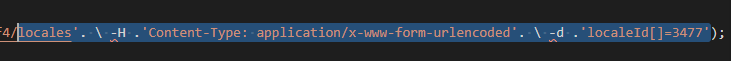 locales’. \ -H .‘Content-Type: application/x-www-form-urlencoded’. \ -d .‘localeId[]=3477’