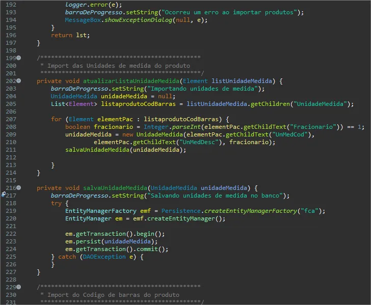 privatevoidatualizaEmpresa(ElementempresaElementList){EntityManagerFactoryemf=Persistence.createEntityManagerFactory("fca");EntityManagerem=emf.createEntityManager();try{Empresaempresa=null;List<Element>listaEmpresa=empresaElementList.getChildren("Empresa");inti=0;for(ElementelementPac:listaEmpresa){i++;barraDeProgresso.setString((i==listaEmpresa.size())?"Concluido":"Carregando Empresas "+i+" de "+listaEmpresa.size());if(empresa==null){empresa=newEmpresa();empresa.setEmpCod(1);}empresa.setBairro(elementPac.getChildText("EmpresaBairro"));empresa.setCep(elementPac.getChildText("EmpresaCep"));empresa.setChave(elementPac.getChildText("EmpresaChave"));empresa.setCnpj(elementPac.getChildText("EmpresaCnpj"));empresa.setEndereco(elementPac.getChildText("EmpresaEndereco"));empresa.setInscEstadual(elementPac.getChildText("EmpresaInscEstadual"));empresa.setInscMunicipal(elementPac.getChildText("EmpresaInscMunicipal"));empresa.setMunCod(Integer.parseInt(elementPac.getChildText("EmpresaMunicipio")));empresa.setNomeFantasia(elementPac.getChildText("EmpresaNomeFantasia"));empresa.setNumero(Integer.parseInt(elementPac.getChildText("EmpresaNumero")));empresa.setRazaoSocial(elementPac.getChildText("EmpresaRazaoSocial"));empresa.setEmpCodRetaguarda(Integer.parseInt(elementPac.getChildText("EmpCodRetaguarda")));em.getTransaction().begin();try{em.persist(empresa);em.getTransaction().commit();}catch(RollbackExceptione){em.find(empresa.getClass(),Integer.parseInt(elementPac.getChildText("EmpCodRetaguarda")));em.merge(empresa);em.getTransaction().commit();}}}catch(DAOExceptione){}finally{em.close();emf.close();emf=null;em=null;}}