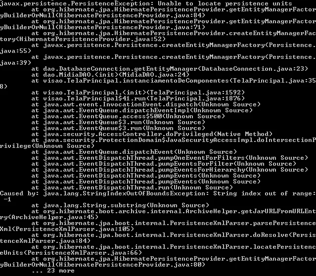 Galera, tenho um programa Java que usa Hibernate e H2 Database. Venho a um bom tempo trabalhando com o projeto e executando pelo eclipse, porém agora converti para .jar e o projeto não quis executar. Aí rodei pelo terminal e foi lançada essa excessão: