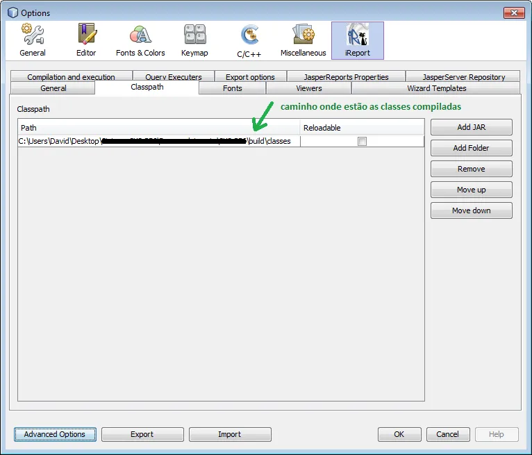 O parte do classpath, estou mostrando de dentro do plugin do NetBeans, mas no standalone não é difícil de encontrar. Acho que é nas preferências do IReport.