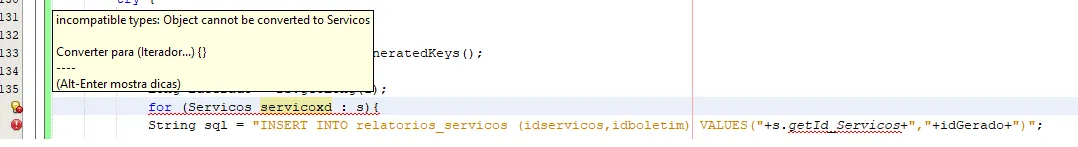 publicvoidinserir(Lists,Requisicaor)throwsSQLException{PreparedStatementinserir=con.prepareStatement("INSERT INTO boletim (idcomputador_requisicao,data_saida) VALUES("+r.getId()+",now())",PreparedStatement.RETURN_GENERATED_KEYS);try{con.setAutoCommit(false);inserir.executeUpdate();ResultSetrs=inserir.getGeneratedKeys();rs.next();LongidGerado=rs.getLong(1);for(Servicosservicoxd:s){Stringsql="INSERT INTO relatorios_servicos (idservicos,idboletim) VALUES("+s.getId_Servicos+","+idGerado+")";PreparedStatementinserirx=con.prepareStatement(sql);inserirx.executeUpdate();}}catch(SQLExceptionex){}}