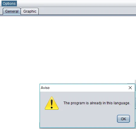 O que acontece quando eu seleciono um idioma que é igual ao do programa (note a opção “Options” selecionada mesmo com a mensagem aberta):