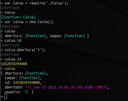 > caixa.abertura(1); { abertura: [Function], saque: [Function], id: '1452812532191' abertoEm: '14-01-16T21:01:12' usuario: '1' totalConta: '1000.00' }