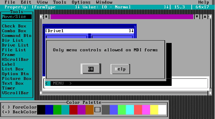 Ola Estou Com Problemas No MDI meu formulario de visual basic não aceita mdi quando eu clico em form type e mudo o valor para MDI ocorre um eroo o seguinte erro :Only menu controls allowed on MDI formsquando clico em OK o valor volta ao normal e o MDI não funciona gpstaria de saber como corigir esse erro ou um outro metodo para fazer a função MDI lembrando que estou usando visual basic 1.0Desde já agradeço.