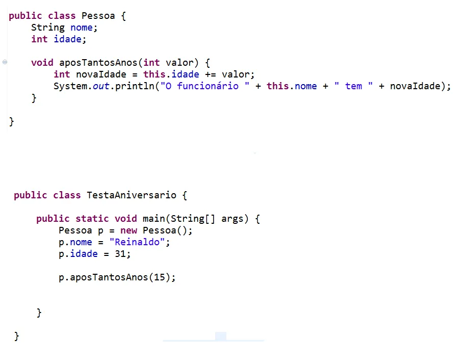 voidaposTantosAnos(intvalor){intnovaIdade=this.idade+=valor;System.out.println("O funcionário "+this.nome+" tem "+novaIdade);}