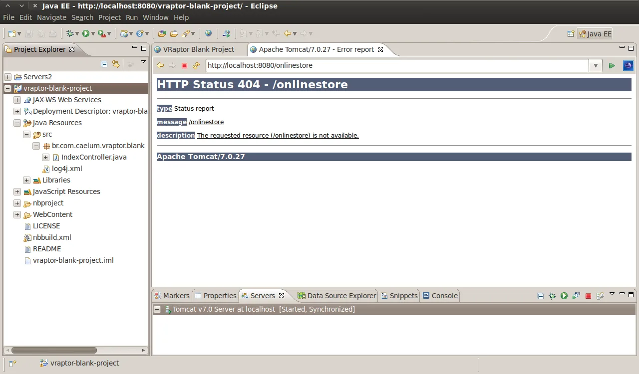 Consegui ver o “It Works!” que o guia inicial de 10 minutos da apostila da Caelum pede, mas na hora de mudar o endereço de acesso de http://localhost:8080/vraptor-blank-project/ para http://localhost:8080/onlinestore começo com meus problemas.