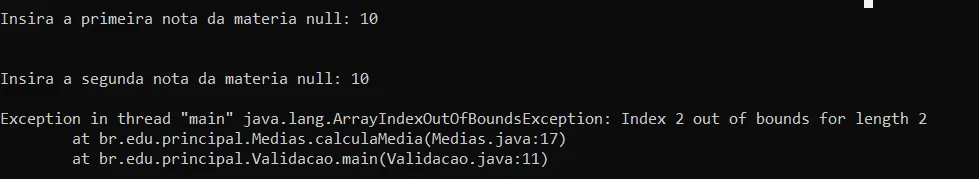 packagebr.edu.principal;publicclassValidacao{publicstaticvoidmain(String[]args){NotasclasseNotas=newNotas();MediasclasseMedias=newMedias();String[]materias=classeNotas.lerMaterias();float[]medias=classeMedias.calculaMedia();intcontador=0;classeNotas.lerMaterias();classeMedias.calculaMedia();while(contador<=5){if(medias[contador]>=70){System.out.printf("Sua media na matéria %s foi %.2f e voce foi aprovado!",materias[contador],medias[contador]);}if(medias[contador]<70&medias[contador]>30){System.out.printf("Sua media na matéria %s foi %.2f e voce ficou em exame!",materias[contador],medias[contador]);}if(medias[contador]<30){System.out.printf("Sua media na matéria %s foi %.2f e voce reprovou!",materias[contador],medias[contador]);}}}}