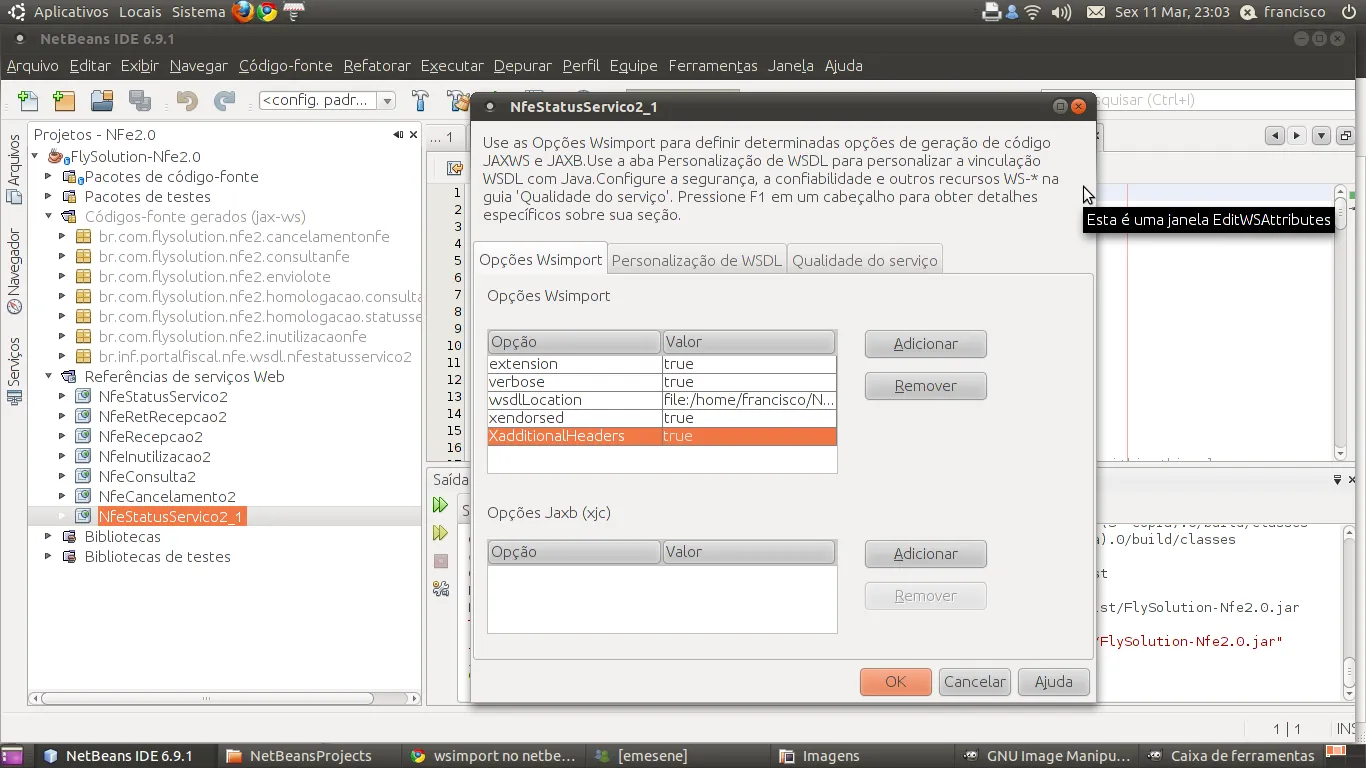 Ola pessoal, para gerar o stubs de maneira correta (com o cabeçalho e body) para NF-e 2.0 que envia o header no SOAP 1.2 preciso passar essa linha “wsimport -extension -XadditionalHeaders” como faço isso no netbaens ?